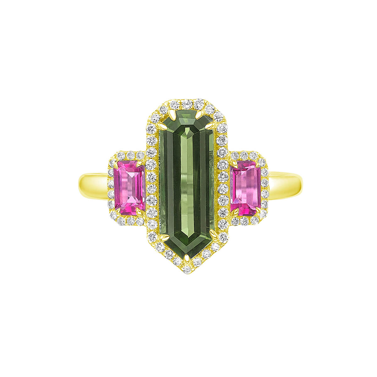 A two-colour, fancy-shape gemstone ring accented with a diamond halo. This look is truly a conversation piece and also has a matching pendant.