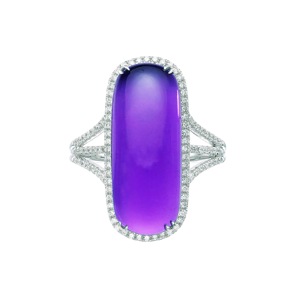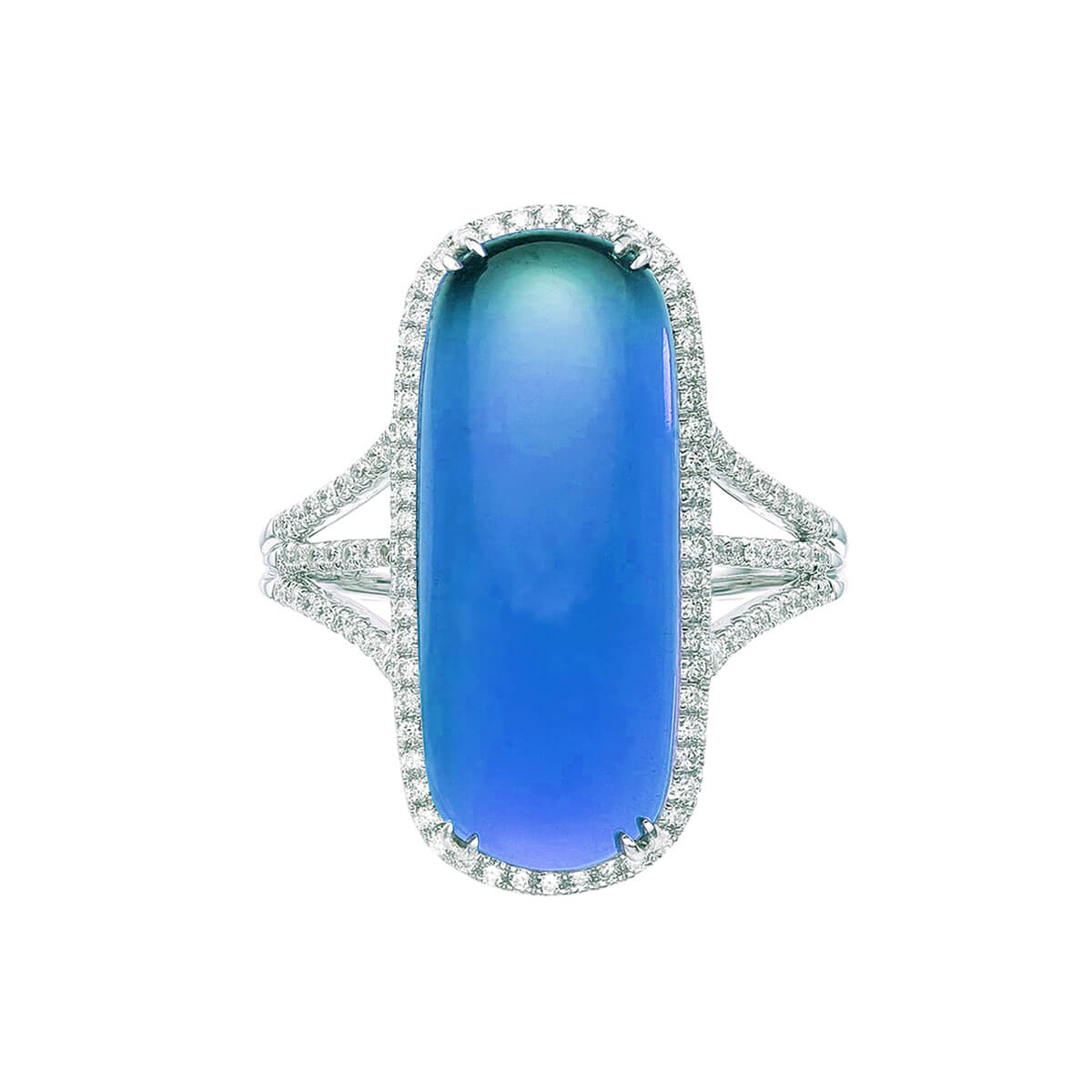 Prong-set gemstone cabochon ring with diamond halo